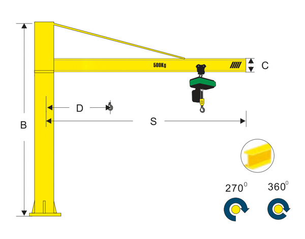 柱式旋臂起重機是近年來發(fā)展起來的中小型吊運設備。其結構獨特,安全可靠,具有高 效、節(jié) 能、省時、省力、靈活的特點。與電動葫蘆或手拉葫蘆配套使用,能在三維空間內(nèi)隨意操作,特別是在短距、密集性吊運的場合更能顯示出比常規(guī)吊運設備唯有的優(yōu) 越性。廣泛應用于車間、倉庫、碼頭等固定場所。